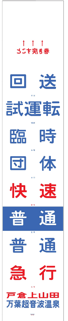 実際の方向幕を作っているメーカーで製作した1/1レプリカ方向幕です。実物の材料・インク・製作方法で印刷しております。こちらはクハ115-1106の前頭行先幕から種別表示9コマのみを収録したタイプです。青地と白字両方の「普通」と「戸倉上山田 万葉超音波温泉」に加えて前頭行先幕にはない「急行」を収録しています。前後の余白付きで先端と終端には「↑巻き戻すこと↑」の表示も入っています。