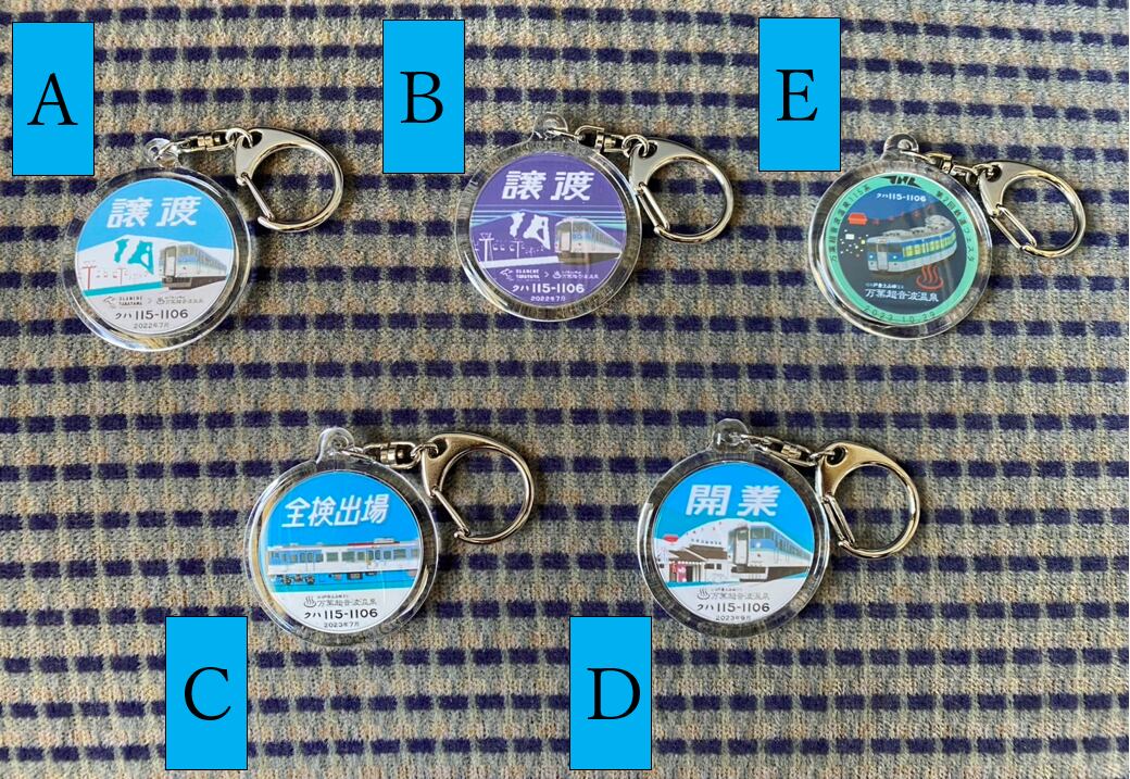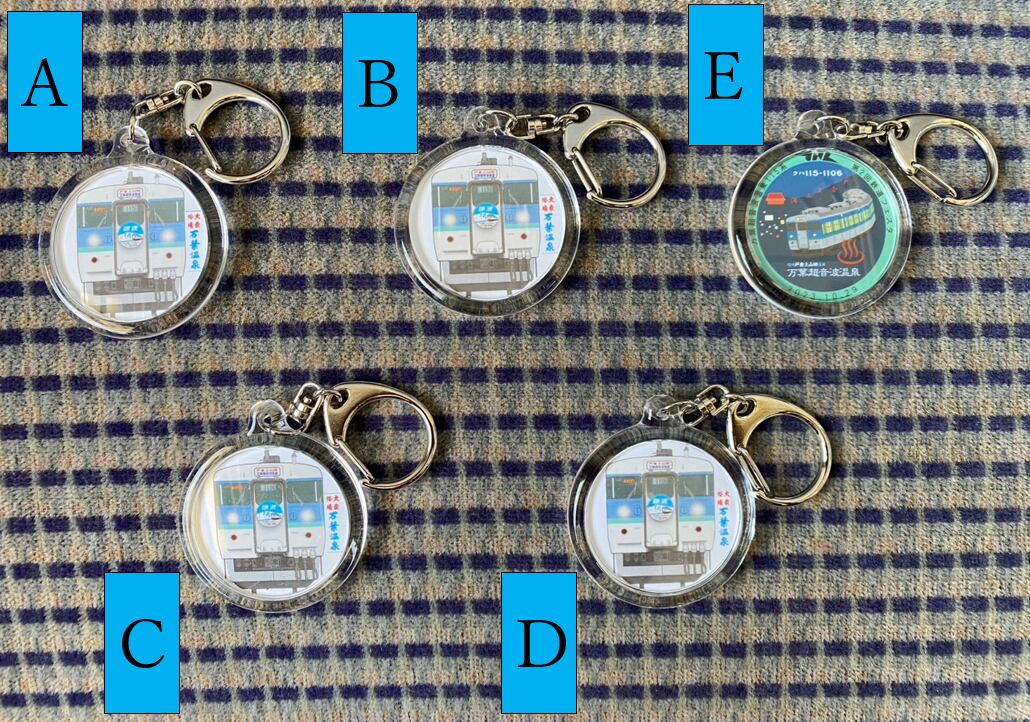 万葉超音波温泉の売れ筋ナンバー1商品です。クハ115-1106のキーホルダーと万葉超音波温泉のキーホルダーをご用意しています。数種類ありますので選択してご購入ください。